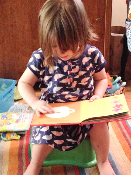 Ella is past 3 1/2 years old and still in diapers. We attempted potty training at the beginning of the summer. It was a disaster. I told myself we’d wait a month and try again. But by then, I’d crashed. Do you know how much energy is required to potty train a stubborn headstrong girl like Eleanor? I don’t think its quantifiable. But she has been reading up: